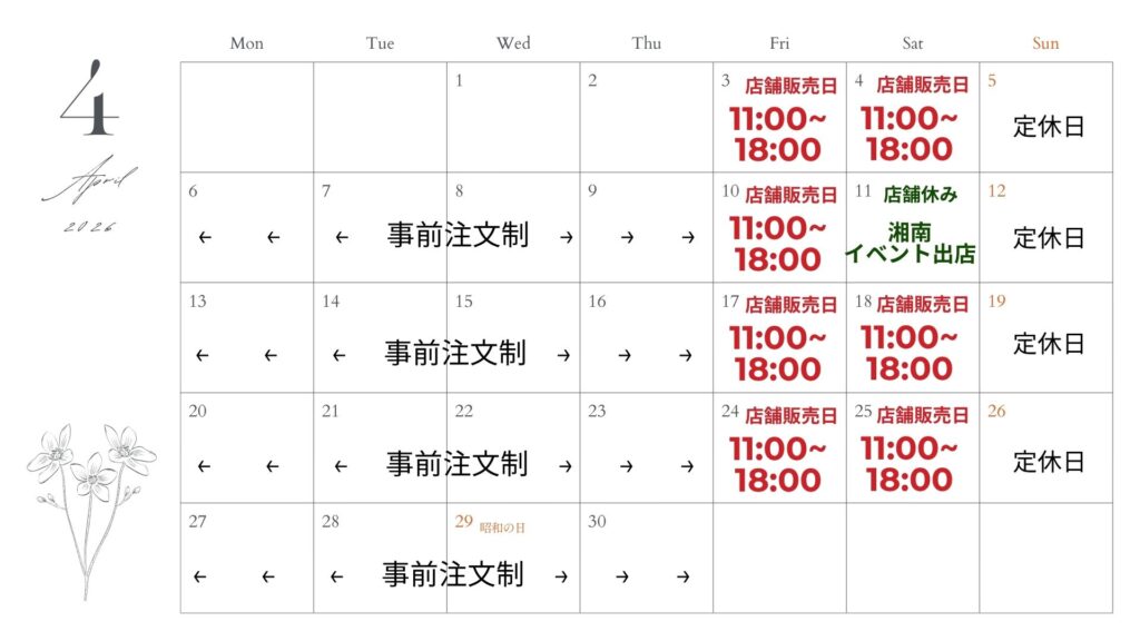 ※4月11日はマルシェ出店のためお店は空いておりません。